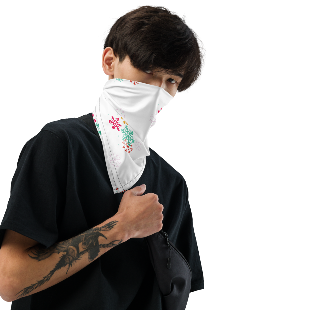 Bright and joyful, this bandana bursts with colorful snowflakes in cheerful reds, golds, and teals β a playful nod to holiday magic and winter wonder.