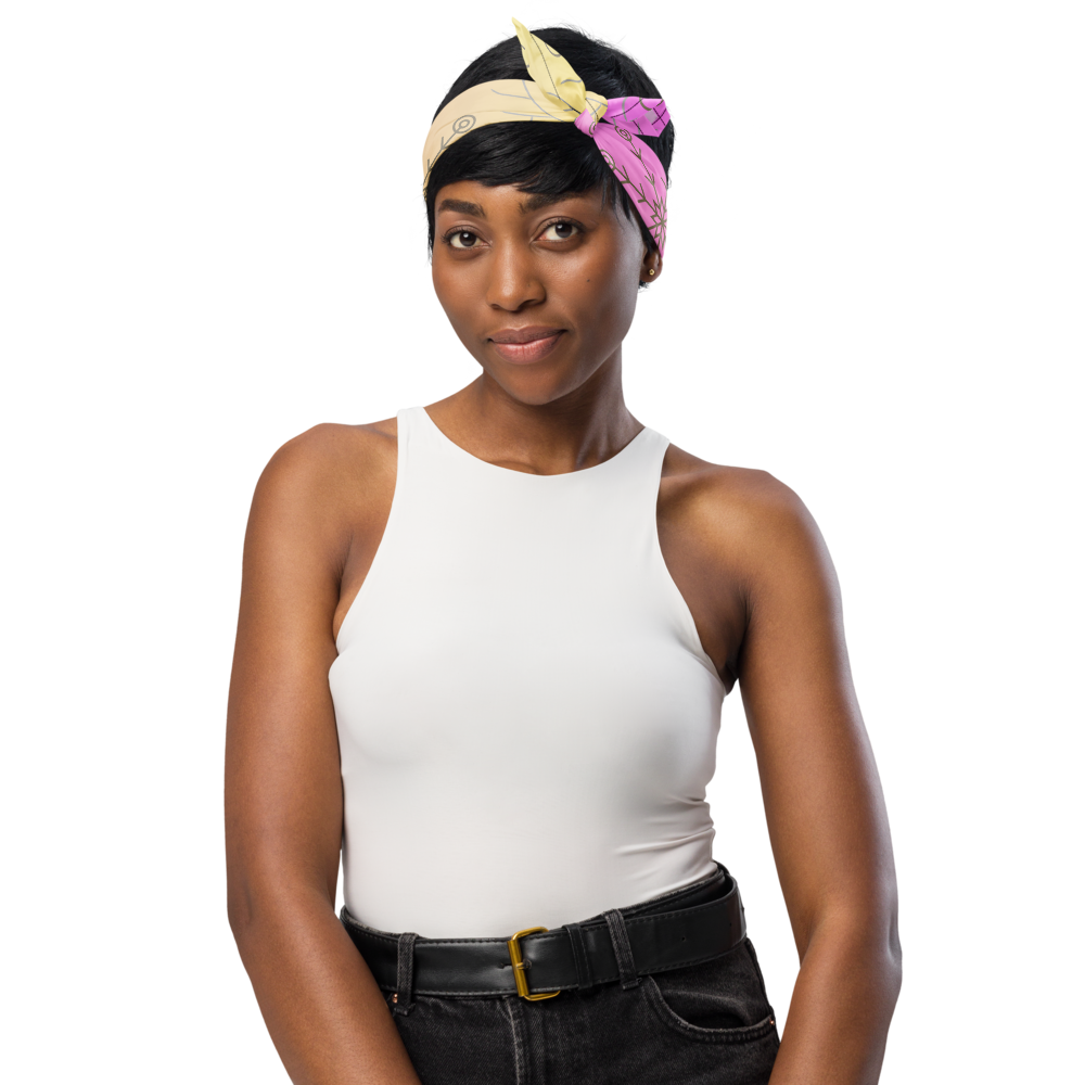 A sassy twist on winter style β this bandana features delicate snowflakes and leafy branches over a dreamy pink-to-yellow gradient. Perfect for adding a touch of frosty glam to your cozy or chic outfits.