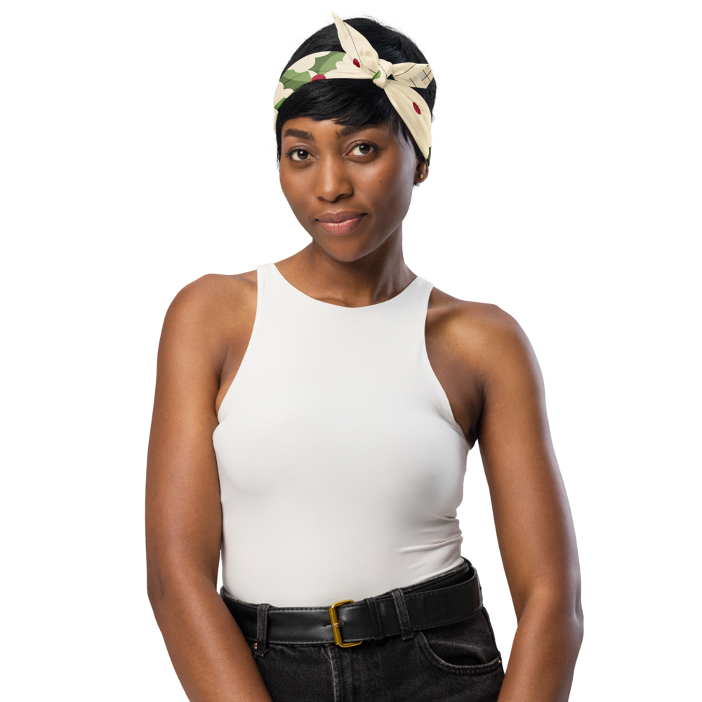 A festive holiday bandana featuring a cheerful pattern of green holly leaves and bright red berries on a soft cream background. Perfect for adding a classic Christmas charm to your winter outfits or seasonal decor.